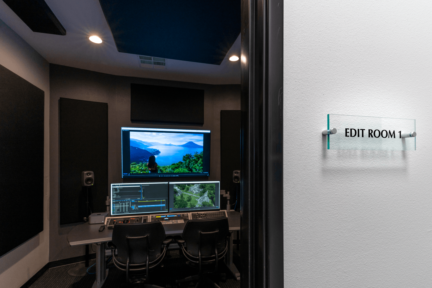 With a robust 6,500 square feet at your disposal, take advantage of our many spaces including an expansive Control Room, Dolby Atmos Mix Room with adjoining ADR/Narration booth, several editing bays, Screening / Color Correction Room, along with (2) accommodating hair and makeup rooms, Dressing Room, Green Room, Conference and production meeting rooms, Kitchen and several restrooms.