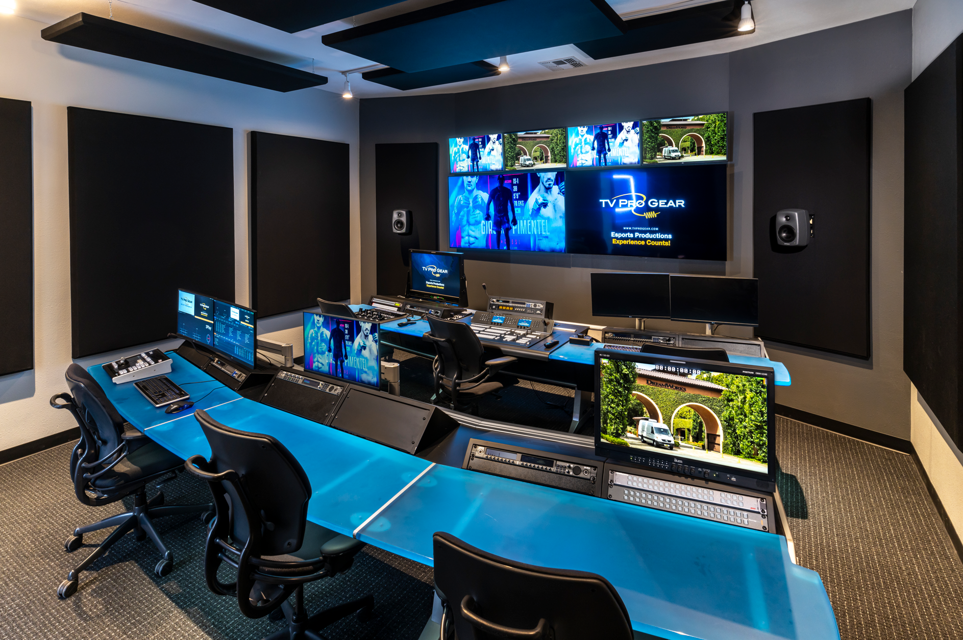 • Expansive Stage Control Room for up to 10 operators with Ross Carbonite, TriCaster TC2 Elite and Blackmagic ATEM Constellations 8K switching options Shader position has a 32” precision 4K/UHD monitor with HDR. Lighting director has 24” precision monitor & DMX controller. Genelec DSP speakers & acoustic panels provide acoustic excellence. Ergonomic production consoles reduce fatigue for long shoot days.